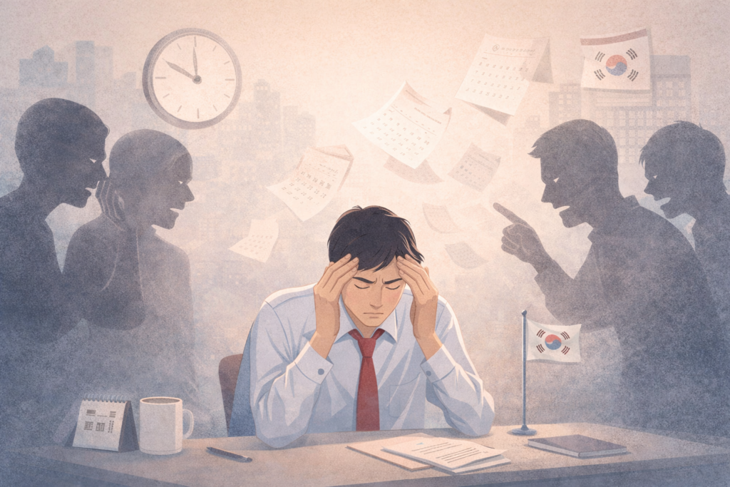From a very young age, Korean society places people in constant competition. The competition begins in kindergarten and continues through elementary school, middle school, high school, university, graduate school, and eventually the workplace. Even outside of work, people are often compared with neighbors, relatives, and friends. Life can begin to feel like an endless ranking system where everyone measures themselves against someone else.
